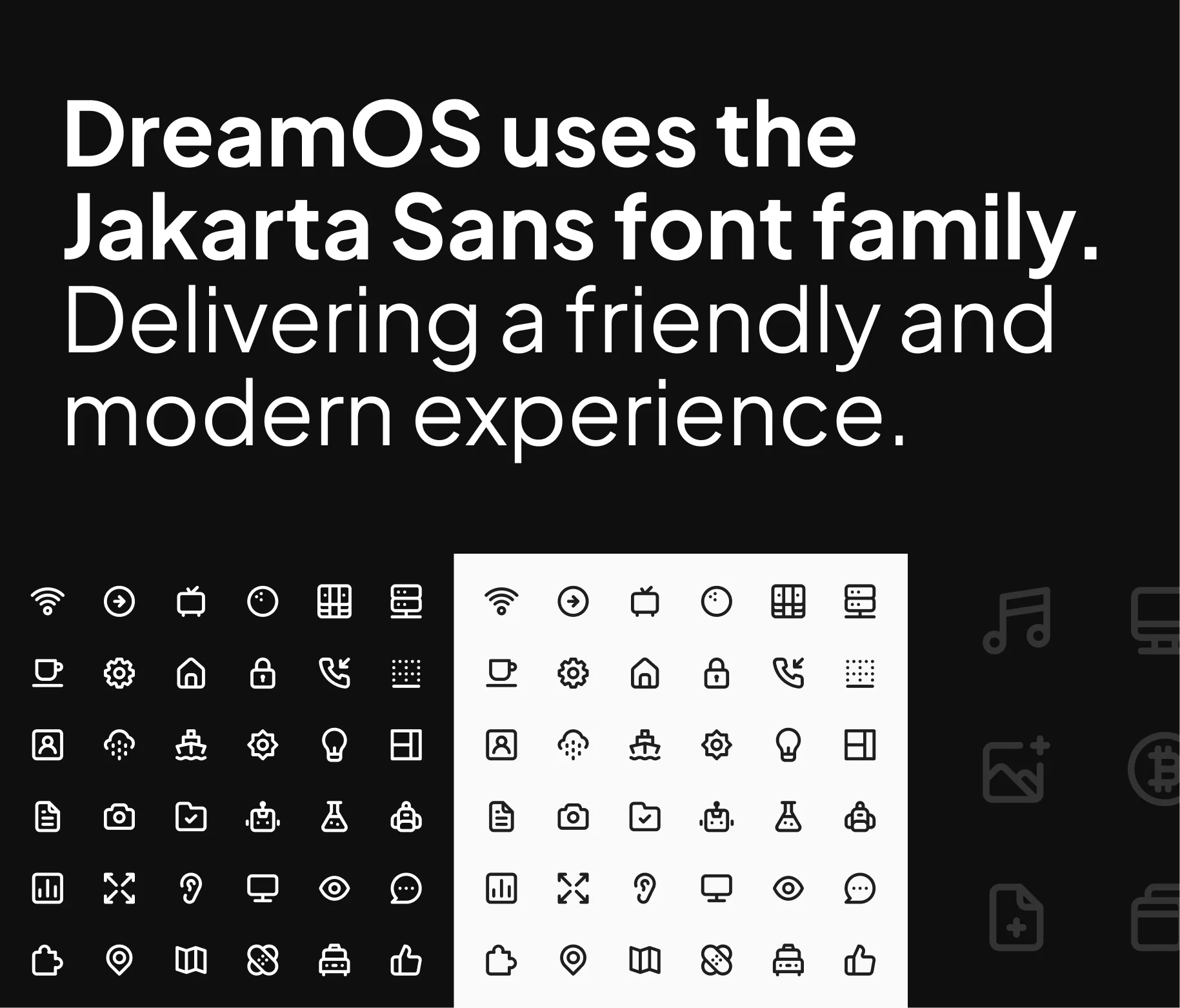 DreamOS uses the Jakarta Sans typeface family by Gumpita Rahayu from Tokotype. Its geometric shape brings joy and excitement to the product, while maintaining its seriousness.